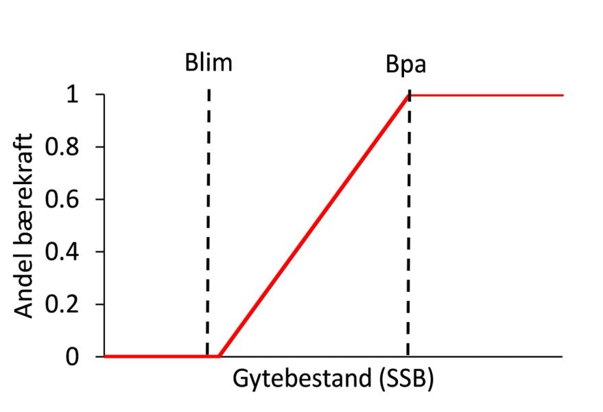Vi satt bærekraft lik null for gytebestand < Blim og bærekraft lik 1 for gytebestand > Bpa, og lot andel bærekraft øke lineært med gytebestand mellom Blim og Bpa:
