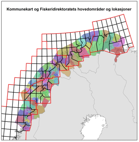 Hver fangst i Fiskeridirektoratets database er angitt med et hovedområde og en lokasjon som viser til hvor fangsten ble tatt. Hovedområder er relativt store områder, og hvert hovedområde består av flere lokasjoner som gir en mer nøyaktig stedsangivelse. For å knytte fangstene til kommune, ble lokasjonene koblet til kommunekartet. Kun lokasjoner som overlappet med kommunene ble med i datasettet. Der hvor lokasjonene overlappet med flere kommuner, beregnet vi arealandeler -dvs. arealandelen av lokasjonen som er innenfor kommunegrensene. Deretter ble fangsten i lokasjonene fordelt på kommuner avhengig av arealandeler.